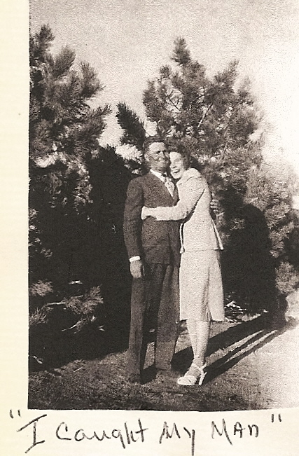 They are just home from their honeymoon and standing beside the row of trees they planted on their homestead. Their arms are wrapped around each other and their faces are spread widely with smiles. He stands tall with a puffed out chest, proud of the woman on his arm. She snuggles up tight to him and laughs, her face hidden in the shadow of his. The caption written in her handwriting says, “I caught my man.”
