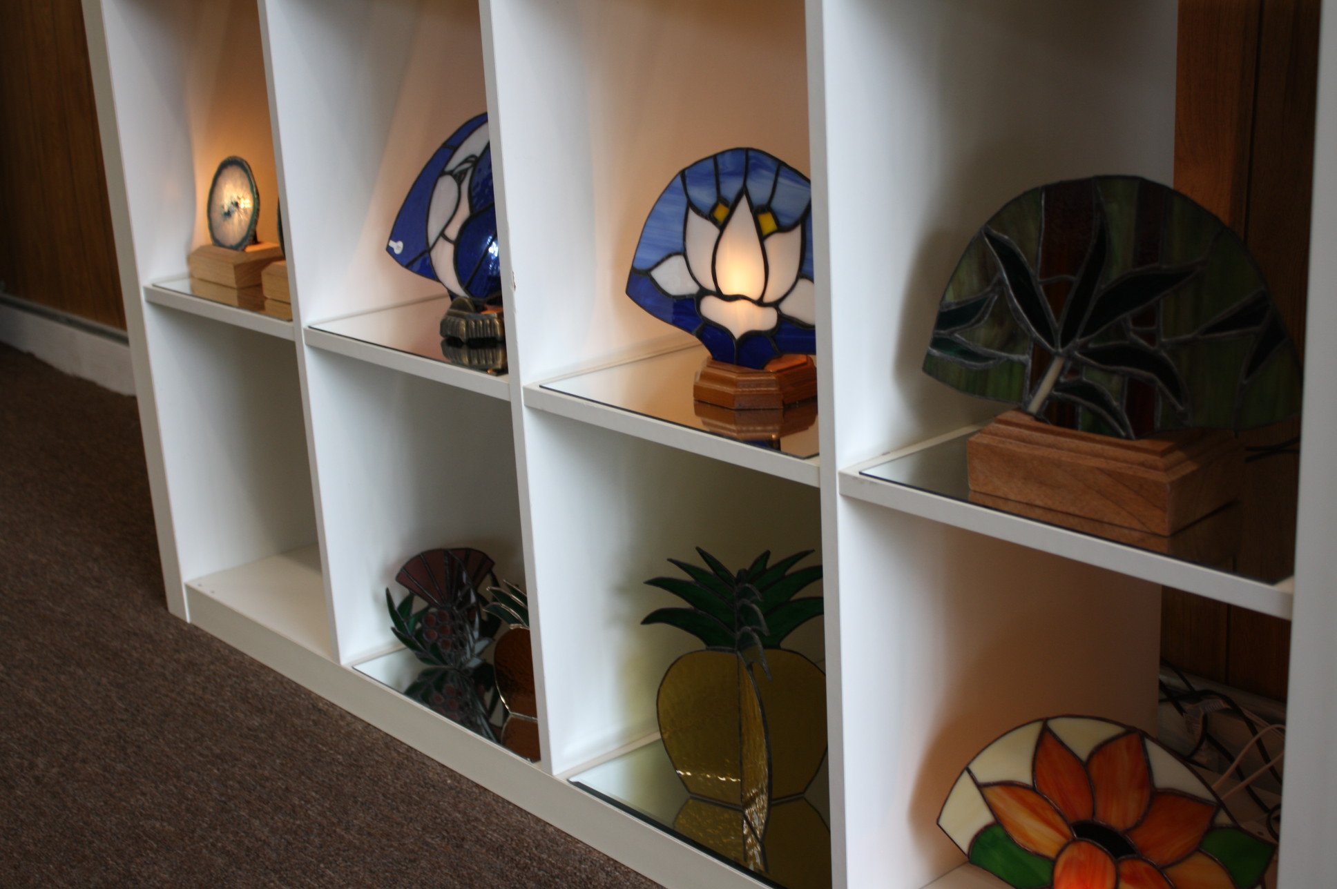 In Art Happens classes, students only buy the glass and sundries (copper foil, solder, etc.) used in their specific project. “We start out with a 12×16 panel with 14 different patterns to choose from..but you go home at the end of it all with a finished product at the end of the class,” Kim explains. “It just makes it a lot easier if everybody is on the same plan in the class…and it is less stressful for everyone. If this is the only piece they will ever make, we want to make it worthwhile.” The stained glass panel class is a seven week long course that meets once a week for 2.5 hours each session. Other classes include nightshades, lamps, boxes, jewelry, yard art, kaleidoscopes, and pet memorials. “It’s just things that people have asked for,” Kim says, explaining the diverse mix of classes.