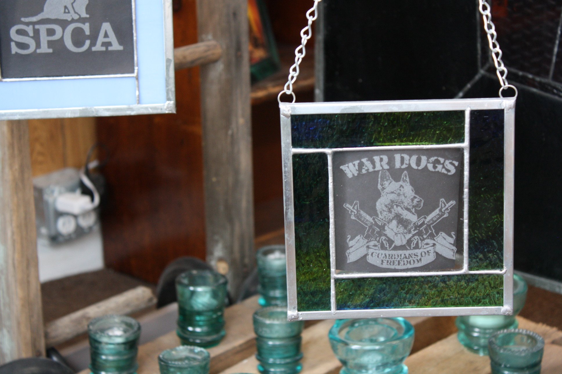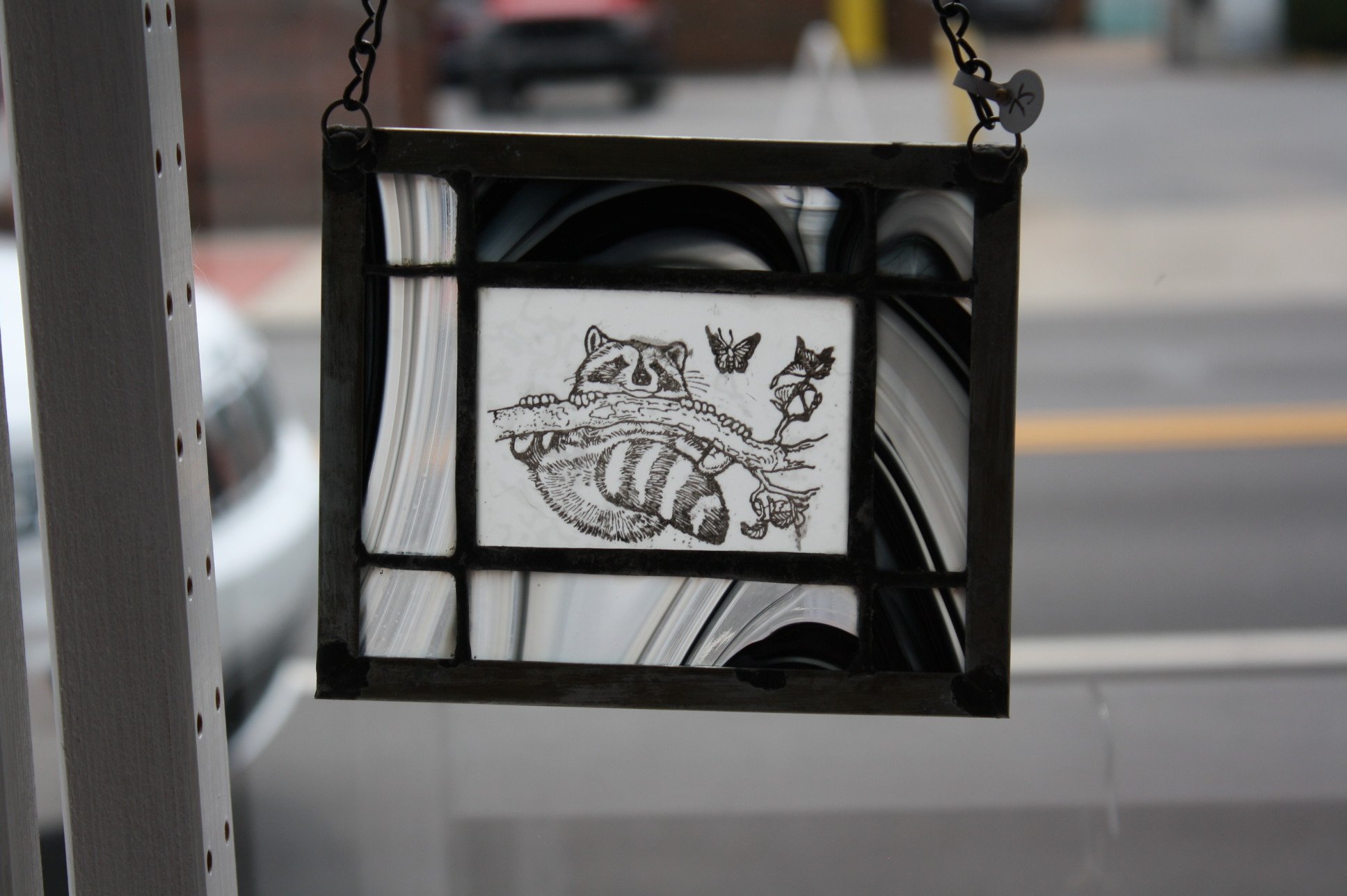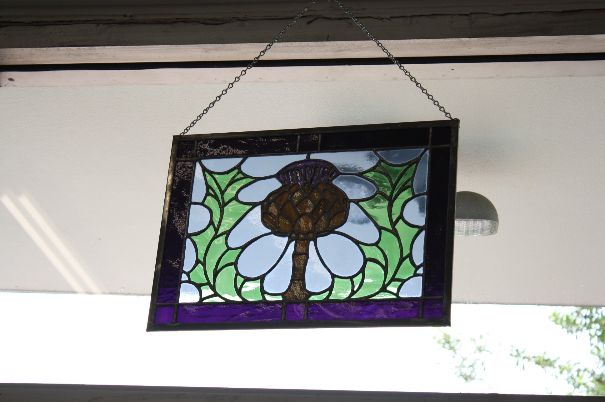 In 2018, Kim moved to North Carolina and opened Art Happens at 106 Tarboro Street in Wilson. Above the door to the store, there is a stained glass panel of a thistle. Kim designed the panel as a nod to her Scottish heritage, and it has served as the original logo design of her business. Guests to the studio are welcomed by the colorful pieces throughout the studio, the expansive work space, and a playfully exuberant pup, Fred.