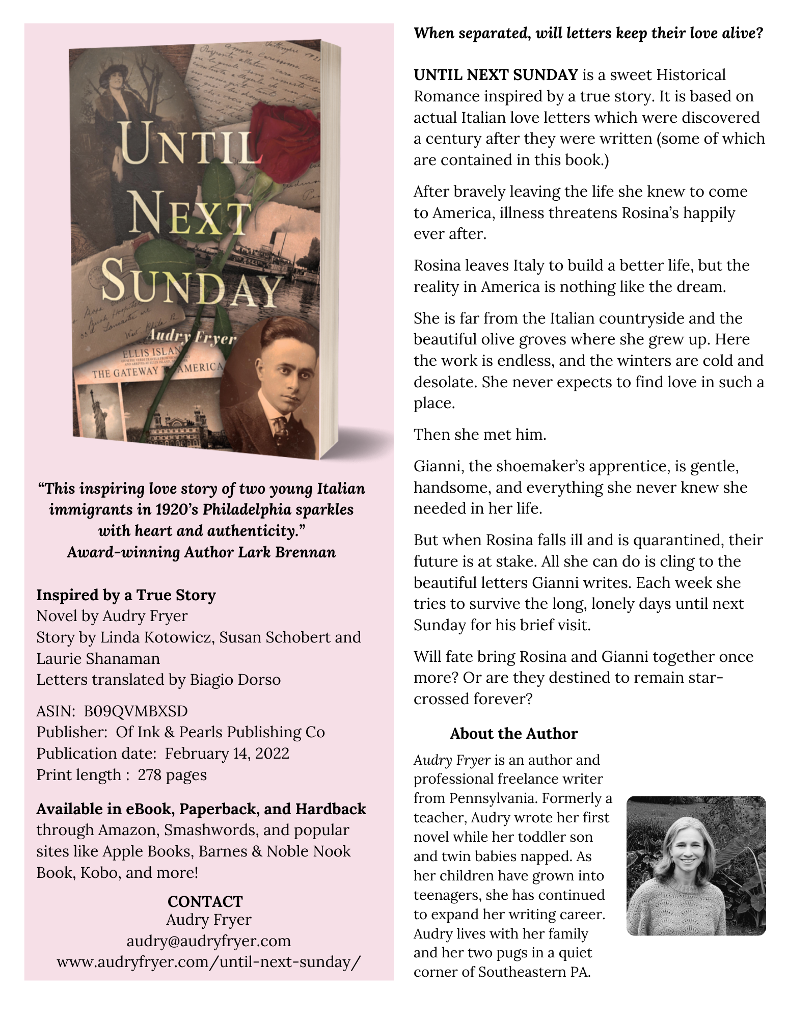 Audry Fryer is an author and professional freelance writer from Pennsylvania. Formerly a teacher, Audry wrote her first novel while her toddler son and twin babies napped. As her children have grown into teenagers, she has expanded her writing career. Audry lives with her family and two pugs in a quiet corner of Southeastern PA. To learn more about Audry, please visit her website at www.audryfryer.com